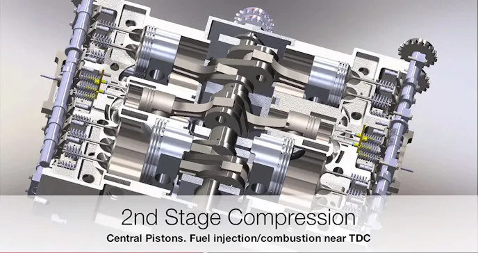 A new engine idea from Motiv Engines hopes to turn this trend completely around. The new engine being proposed by Motive Engines uses an ultra-high compression ratio of 56:1 to create an extremely efficient engine. This multi-stage engine achieves this extreme compression ratio thanks to a separate compression and combustion cylinder. The outer cylinders take air in and compress it in the first stage.
