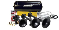 - Kits include air compressor and high pressure steel air tank along with a loud air horn or train horn