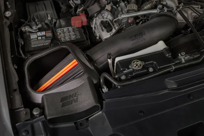 The system uses a hybrid open-top airbox design with an enlarged factory fresh air inlet to help bring in cooler air. The intake tube itself is oversized—the largest diameter K&N has built for these applications—and features velocity channels to smooth airflow at higher demand.