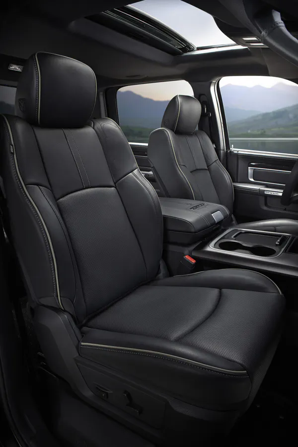 2015 Ram 1500 Laramie LimitedThe Limited starts with an all-black leather cockpit – the seats are covered in Black Natura Plus premium leather. Unique pinstripe stitching designs lend the Ram Laramie Limited an unmatched level of sophistication and style. Graystone leather piping rides the stitching peaks, creating a visible silhouette profile of the seats contrasting an all-black backdrop. Using an idea borrowed from the Longhorn trim, rear flap-closure seatback map pockets with modern, chrome Ram-lettered buckles also are unique to Laramie Limited.