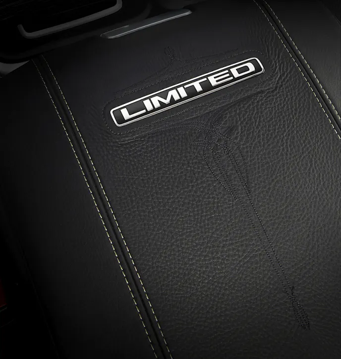 Placed into a black mask background, Ram Laramie Limited’s Liquid Graphite-faced gauges are surrounded with diamond knurled, Liquid Chrome rings, a design cue inspired by modish watches. Gauge needles are finished in white with Liquid Graphite painted hubs. Limited’s cluster also has a unique modern font, with clean white accent lighting to further differentiate the trim. The instrument panel is topped with Graystone accent stitching and fitted with a Liquid Graphite glove box spear, pinstripe design and understated “Limited” badge.
