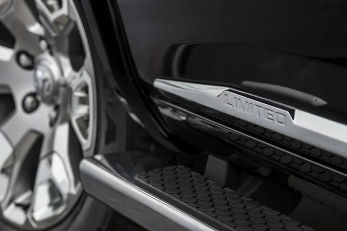 The side profile of the Limited is dressed in chrome accents for body-side molding with etched “Limited” mirrors, door handles, window molding and standard wheel-to-wheel side steps.