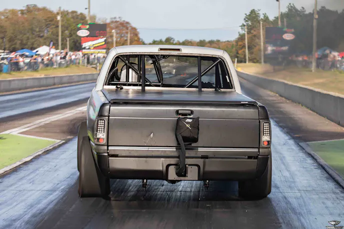 What’s so significant? Cato’s untested truck after going through some serious wintertime changes managed to click off a 5.14 at 139-MPH besting his personal best from last year by a few miles. To make a truck that weighs just over 4,400-pounds go that fast takes clean over 1,700-horsepower. At that power level, you’re for sure going to have the best studs possible, right? Wrong.