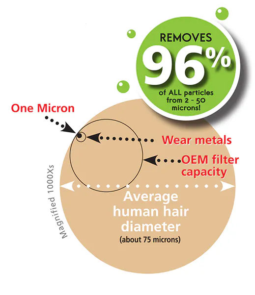 The next sample was drawn from the same dirty oil (without being changed) after adding a Frantz Filter for just 200 miles. This test revealed just 1,641 contaminating particles at 2 microns. That is a 96-percent decrease in contamination after just 200 miles.