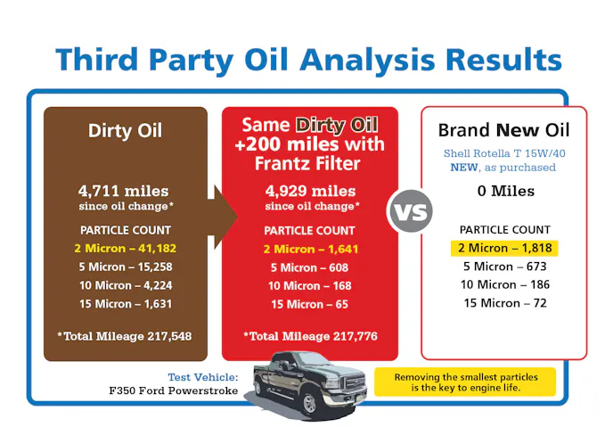 The purpose behind this is to deliver your engine a clean supply of oil that is free of debris and wear metals. In fact, in recent testing, the Frantz system has proven to work so well that it cleaned new oil and made it a better product. Are you getting clean oil in your engine? It doesn’t seem like it. In this test, a Ford F-350 with a 6.0-liter Power Stroke engine had over 215,000 miles.