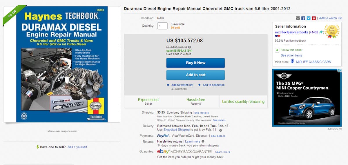 The listing is for a Haynes Duramax Diesel Engine Repair Manual. A quick search on Google turns up a bunch of them for less than $30. Our question to you is this… how have they sold 59 of these manuals?