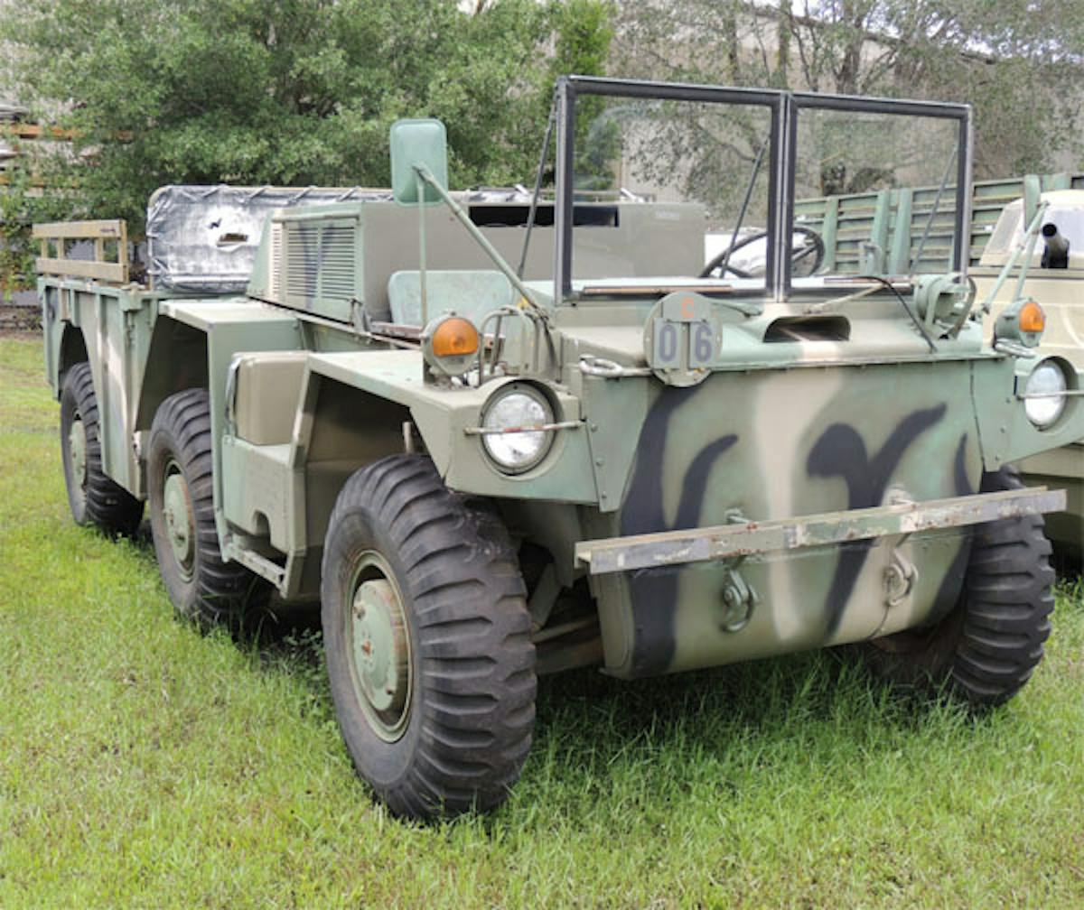 These were conceived during the Vietnam War where fighting on land and water was common place. While the appearance of the vehicle is somewhat deceiving, as it appears a 4 wheeled vehicle is towing a 2 wheeled trailer, this is in fact a single vehicle. The front section of the vehicle was attached to the rear with an articulating joint that gave the Gamma Goat great flexibility. The front could articulate 15 degrees while the rear could articulate 30 degrees. This gave the Goat the ability to handle 45 degrees of articulation.