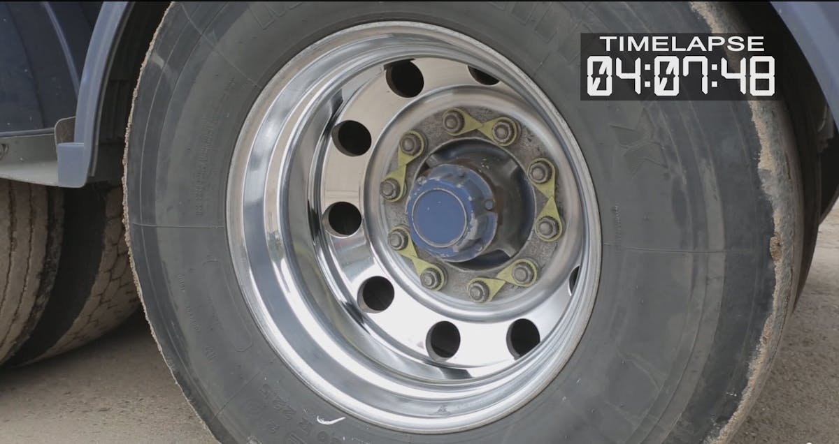 Depending on how dirty the wheels are, will depend on how much pressure you, the operator need to apply. Pressure is applied by pushing the Rimshine into the wheel. For operators who regularly clean their wheels, it may only take four minutes to have clean, polished wheels. These not only make inspection easier and quicker, but help give the truck a more professional and clean appearance. For those that get into a lot of debris and don’t regularly clean your wheels, it may take 15 to 20 minutes to clean. Far less than the hour plus it currently takes with conventional methods.