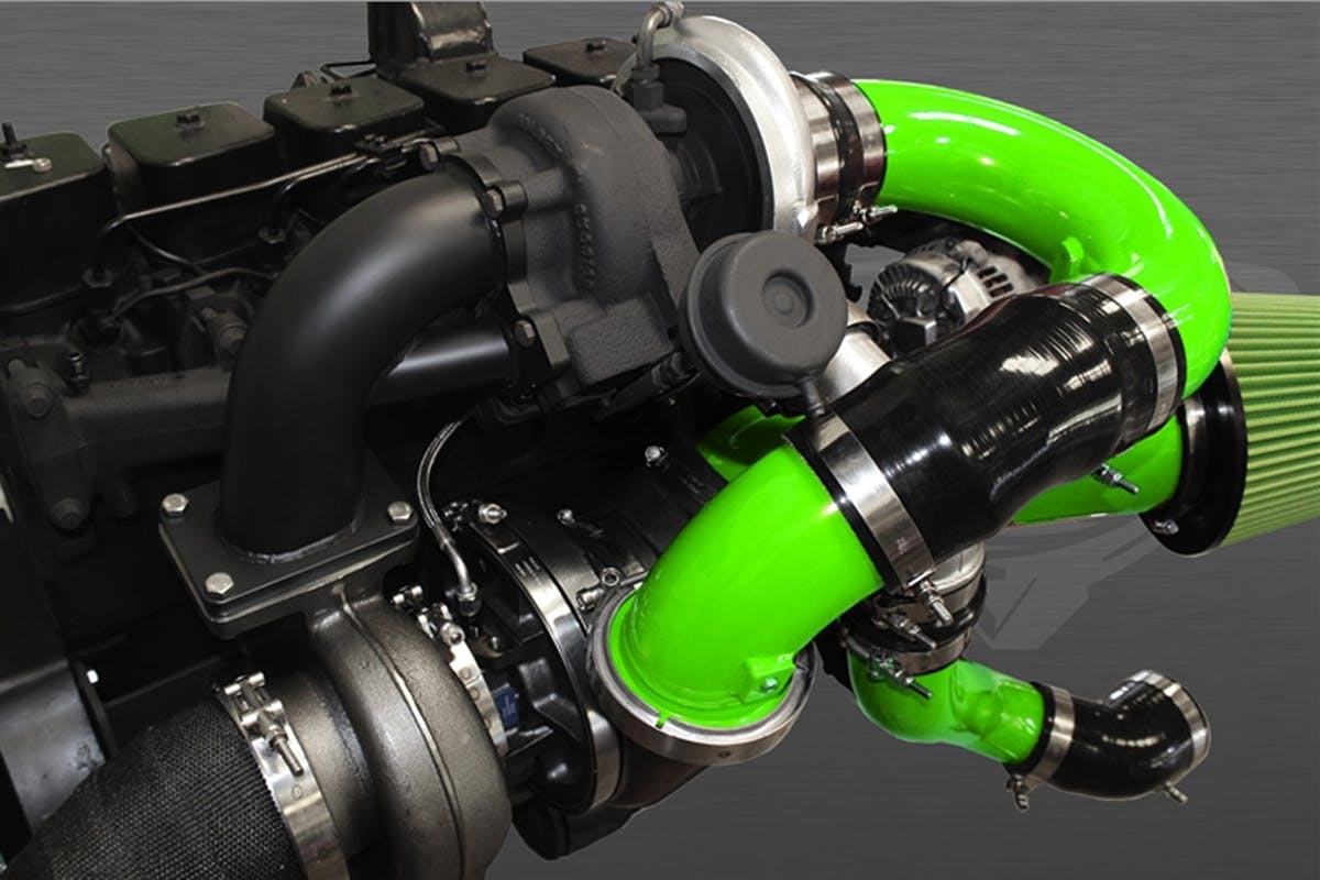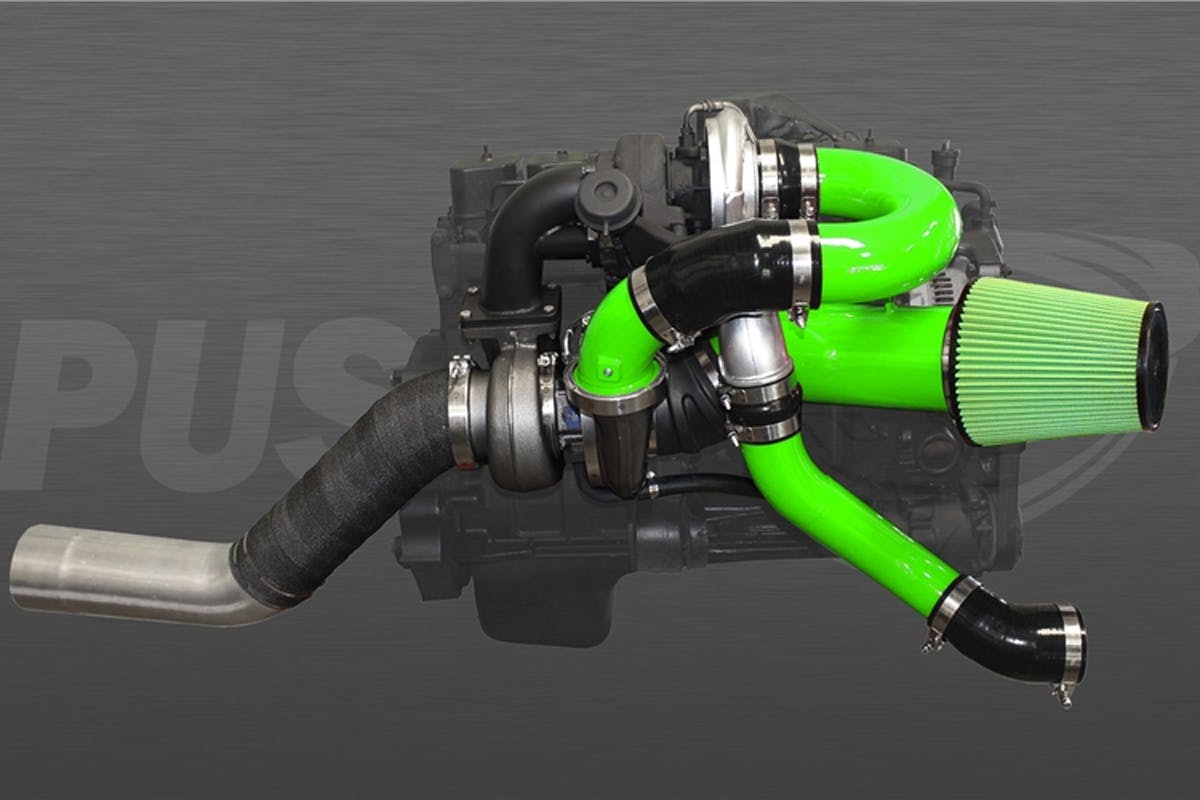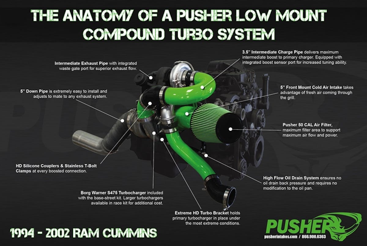 Pusher Intakes has taken this head on and designed a compound turbo setup for the 1994 to 2016 Cummins powered trucks. These are bolt-on kits that come with everything you need to install. They are fully TIG welded, have CNC machined and laser cut flanges, 3.5-inch steel intermediate charge pipe with a port for a boost sensor, 5-inch heat wrapped down pipes, designed to work with stock and most aftermarket exhaust manifolds, and have various powder coat options available.