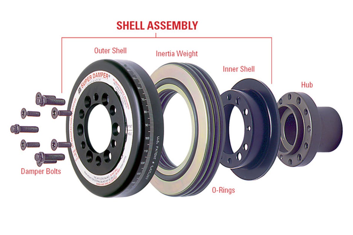 “Our damper is an improvement over that for several reasons,” continued Hults. “It’s constructed with different-sized elastomer o-rings on a single inertia mass captured between the inner and outer shells, making it essentially two dampers in one. Also, it’s SFI-approved, and is even rebuildable and tunable.”