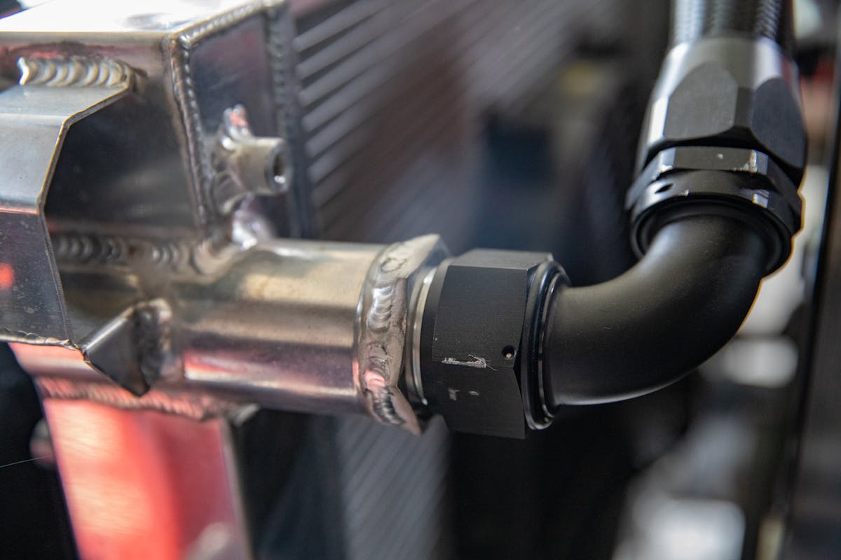 I was excited to showcase the new aluminum radiator because we wanted to weld aluminum bungs onto it to make cleaner connections with AN fittings. Thanks to the guys over at Maverick Diesel, they had the welder hot and ready for me to get the bungs put on. As you can see, this looks way better than the factory and won’t deteriorate like rubber.