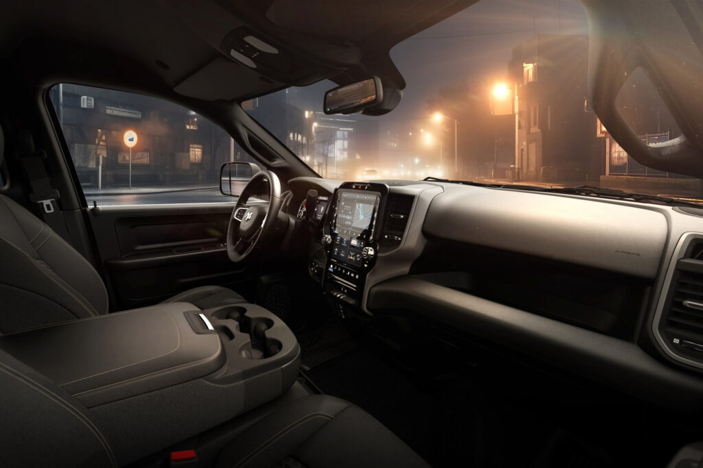 Ram didn’t neglect visibility either. The Warlock features class-exclusive power convex trailer tow mirrors, a small but meaningful edge for HD owners who regularly haul tall or wide trailers. And while the exterior offers seven color options and an unmistakable Warlock bedside decal to set it apart, the cabin is built for real-world use. Black cloth 40/20/40 split-bench seats, carpeted flooring, and front and rear all-weather mats keep the truck comfortable without making you afraid to track in dirt after a day outside.