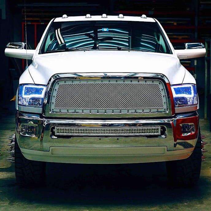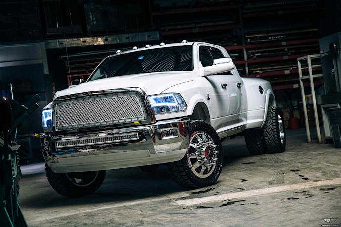 This mega Ram is outfitted with the 6.7-liter Cummins engine and all of the emissions components have been removed and tuning this truck comes from a RaceMe tuner. The engine is fed with cool fresh air from an S&B Intakes cold air intake and the exhaust exits a full MBRP Inc. exhaust system.