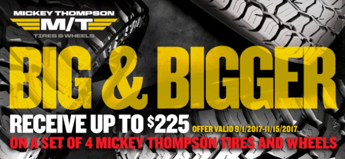 As a buyer, you can then choose from several different tire rebates including a $100 reward on a set of four Deegan 38 inch All-Terrain tires (any size), $125 on a set of four qualifying Mickey Thompson tires under 35 inches or $150 on a set of four qualifying Mickey Thompson tires 35 inches or larger.