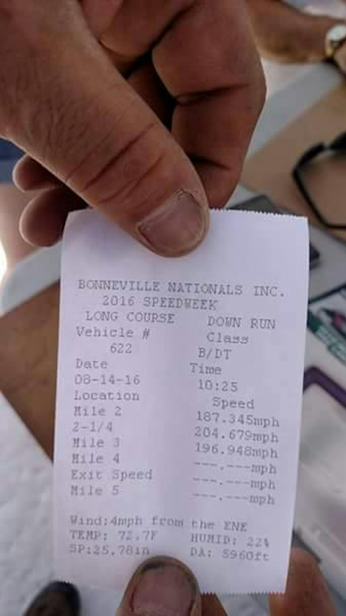 On August 14, 2016, Boyle piloted Sooty down the Bonneville Salt Flats at 204.679 mph which took the land speed record in his class. “With bigger injectors, we can make 1,500 horsepower, but we need to control the EGT’s”, said Boyle. “With that being said, we can expect an even bigger number at the end of the track.”