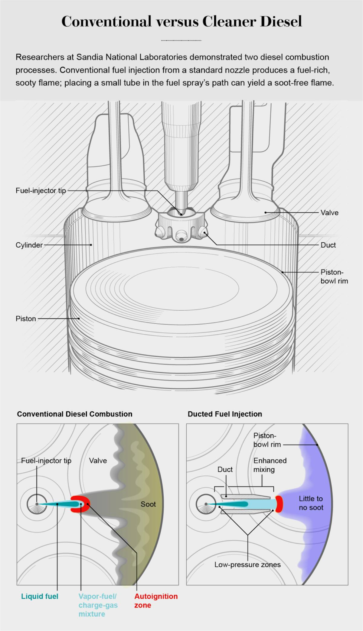 Sandia’s newest design is called Ducted Fuel Injection. DFI is, in their words, a similar design of a Bunsen burner” like you may have seen used in high school or college. Unlike the traditional design of fuel being sprayed from an injector straight into the combustion chamber, there are ducts just outside the injector openings that the fuel will travel through first.