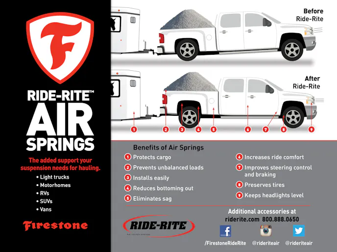When it comes to what separates the Ride-Rite system from the competition, Fessel said, “Firestone is the original patent holder of air springs. We’re the world’s largest manufacturer, and we supply air springs – Airide – to everything from over-the-road semi trucks down to pickups. We’ve taken what we’ve learned to survive in the most arduous, demanding cargo hauling applications, and scaled it down to put it into the Ride-Rite kit. It’s the same rubber and reinforcing cords, the same corrosion-resistant material; there are unique features to our product that no one else has.”