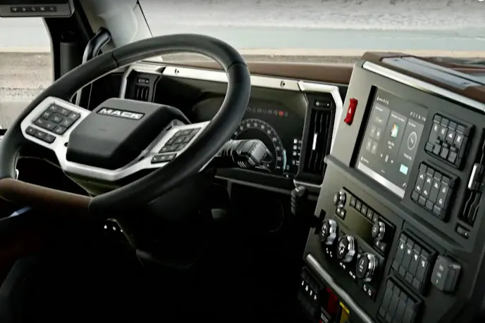 Long gone are the days of sub-par interiors. The Mack Pioneer’s cabin features high-quality materials for a classy look and refined experience. An optional upgraded called Mack Integrated Parking Cooler uses the truck’s batteries and integrated HVAC system to cool the cabin without idling the engine, resulting in driver comfort, energy efficiency, and reduced emissions. The Pioneer’s new seats have wider and taller frames with more prominent shoulder and headrest areas. A first for Mack, these seats have armrests on both sides, so drivers don’t have to rest their arms on door panels. These perforated seats also allow for heating, cooling, and massage functionality. Other interior highlights include a push-button start; steering column gear selector; industry-first flat-bottom steering wheel combined with an advanced active steering system called Command Steer; wireless charging options; Electronic Log Device (ELD) mounting plate; tablet holder; customizable switch layout; one-piece windshield; and more.