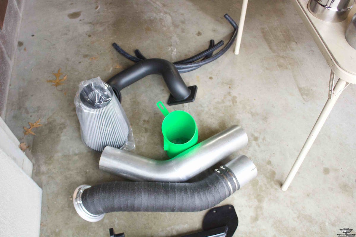 In hopes of turning this truck into the perfect towing machine, we replaced the 66-mm turbocharger with a BD Diesel Performance Screamer HE351VE as our factory charger was long gone. We knew that we would work with Pusher soon on this high mount kit so we went ahead and got a head start. Now, we’re here unboxing our kit to make sure everything is ready for installation. Pusher designed this system to be installed by the average truck owner in their driveway, thus everything that was included in our kit was all we needed to perform the install.