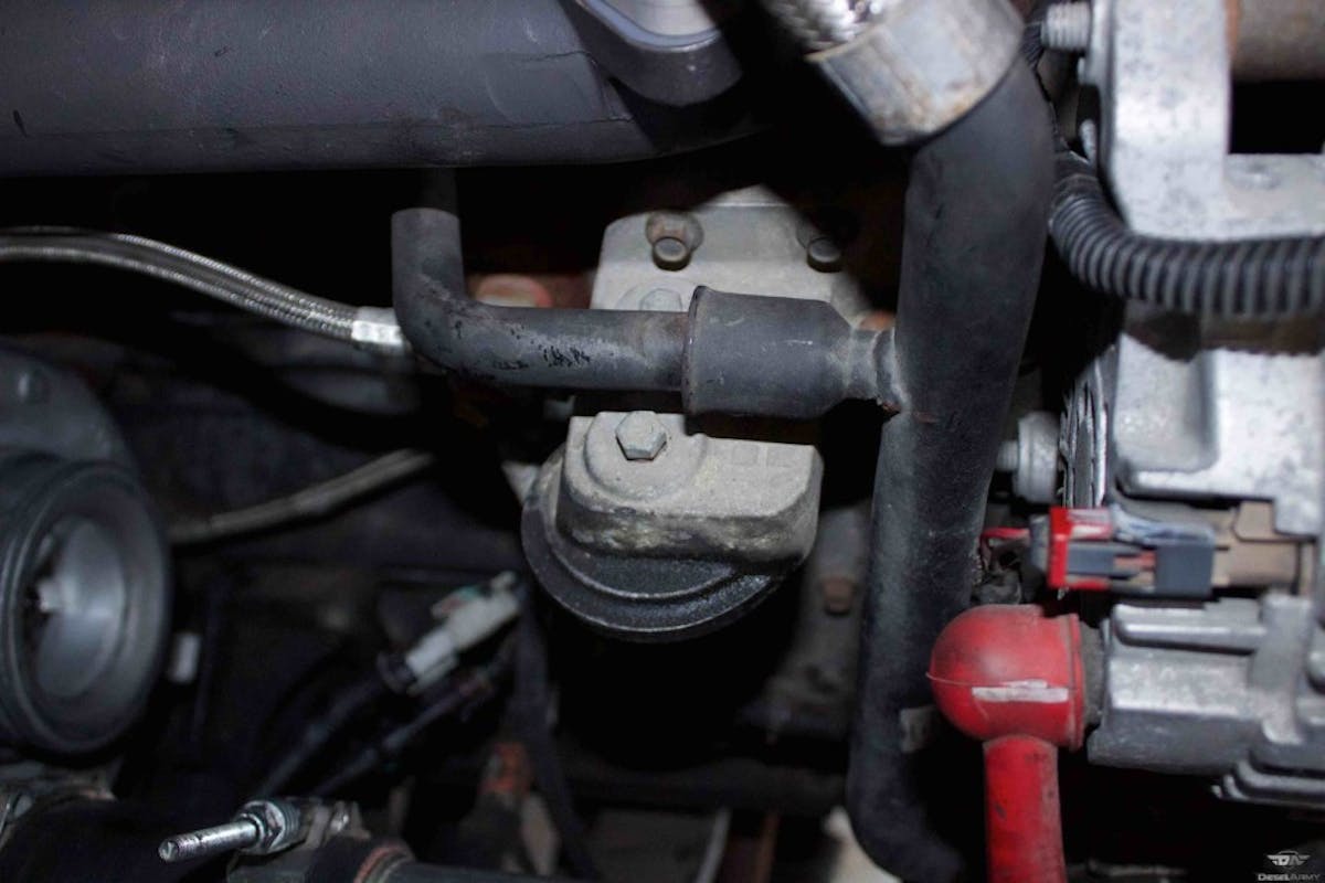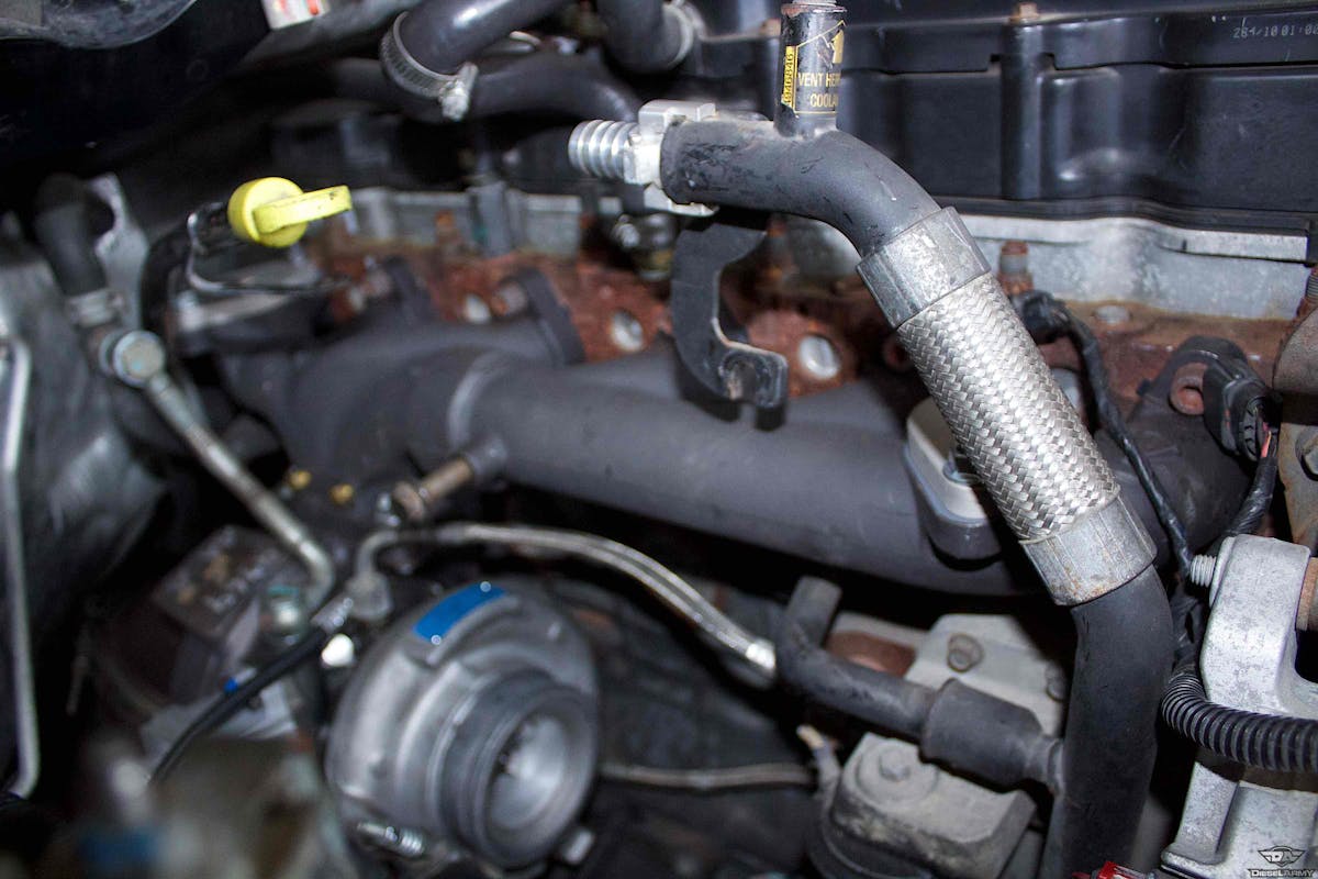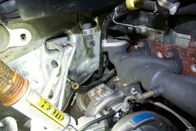 To begin, we did the necessary things to begin and expose our working area including draining the coolant, removing the coolant standpipe kit, and removing the existing air intake on the factory location turbocharger. Pusher includes a neat coolant reroute system that cleans up the overall look of the passenger side of the engine considerably for aesthetics and to make room for the additional turbo. In order to install this setup, the coolant stand must be removed and cut at the specified location. With the new adapter fitting installed into the remaining pipe, this plumbed coolant to the factory turbocharger still and also fed back to the heater core but still freeing up a ton of room.