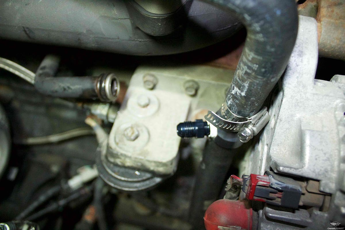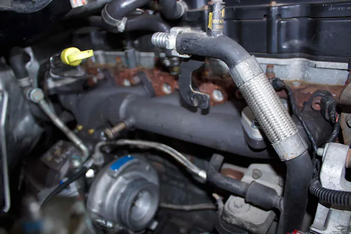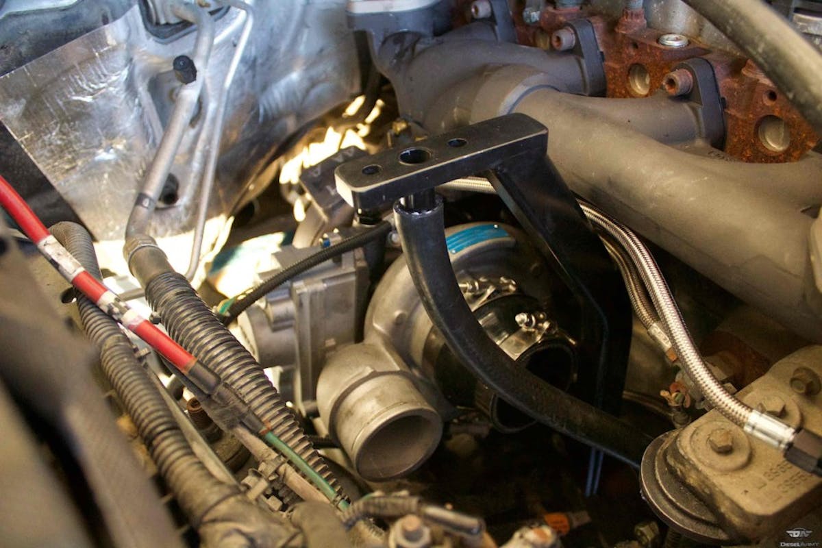By using the supplied hardware, we fastened the bracket to the engine blocks. Before setting the turbocharger on the actual mount, we needed to install the turbos oil drain. A lot of times, in other kits we’ve seen, the oil drain doesn’t fit as good as this. The HD bracket has an attached nipple for the supplied drain hose to fit over which makes it easy to attach and tighten. With the hose attached and clamped, we installed the drain fitting into the engine block. Be sure and lubricate the fitting before installing into the block. It is an o-ring fit and will require some strength.