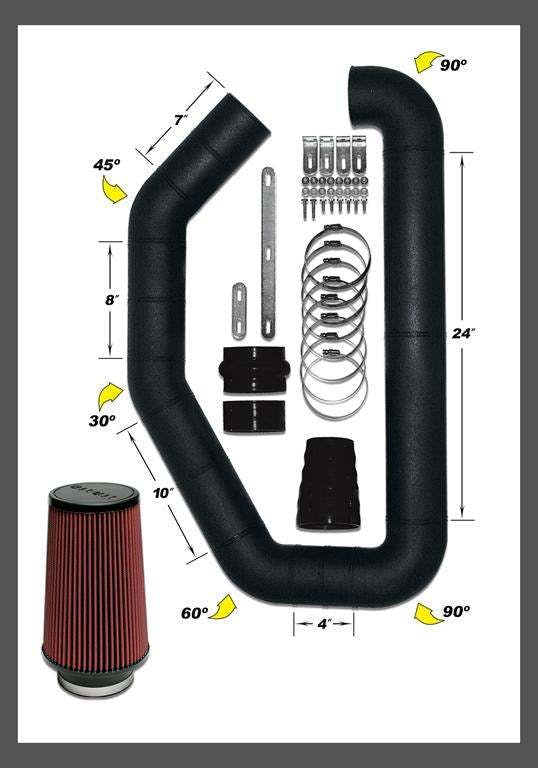 Well, recently Airaid made it a little easier to build custom intakes with their U-Build-It (UBI) kits. The kits are designed with two 90 degree bends, one 60, 45 and 30 degree bend. Then there are a bunch of different length straight pieces. Now I know what you are thinking, the picture shows all of this as one big tube. So, you are going to have to cut the pipe apart and then you are left with tubing and elbows just like if you bought random elbows and what not at the local performance shop.