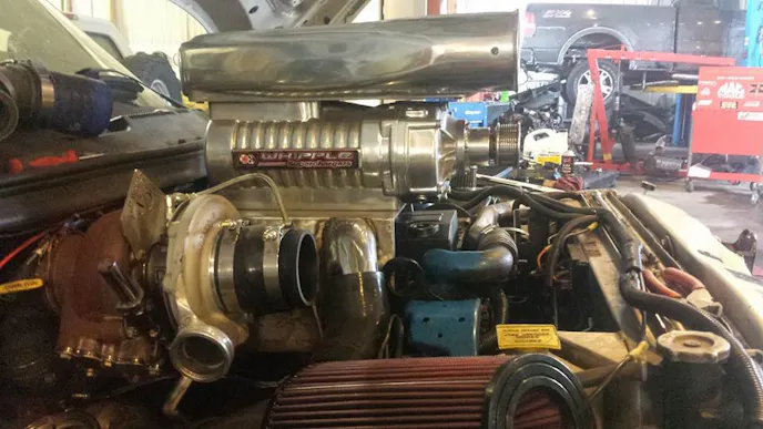 We have started to see more and more trucks with superchargers sitting on top. Not all of them are solely relying on the supercharger like J&R Racing is. Some are still running compounds like this latest one being shown off by the guys at White Knuckles Garage. The original setup was designed by Crazy Carl’s Turbochargers and is actually running a set of compounds semi feed by the supercharger.
