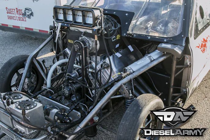 The supercharged Cummins’ huffer is believed to use a supercharger off of a ’03-’04 Ford SVT Cobra (Whipple 3.3-liter) that is mounted on a custom plenum. The compounds are from Stainless Diesel and are comprised of a 63/14 high-pressure charger being fed by a BorgWarner S400 with an 80mm compressor wheel.