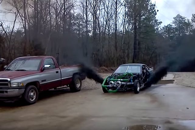 To be fair, just nine of the ten vehicles in the above video are actually cars (a really badass Dodge pickup blowing the doors off a Camaro somehow snuck in), but most of these are high-caliber contraptions. Some we’ve already seen, like the unfortunately-named “CumStang”, a Mustang packing a Cummins motor. On the more diminutive side of the diesel equation is a Volkswagen Polo and Skoda Fabia that line up on the drag strip. There’s also “Black Smoke”, a diesel-powered drift wagon of Mercedes origin.