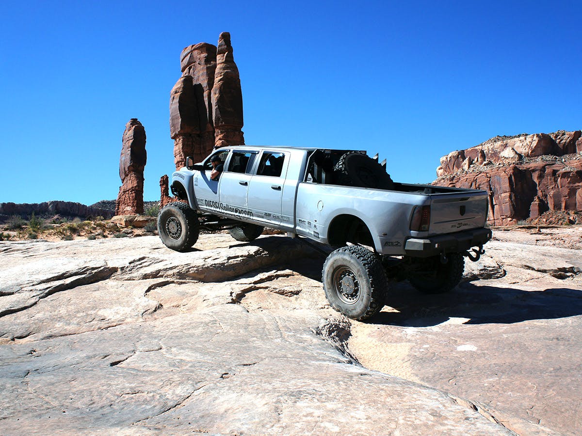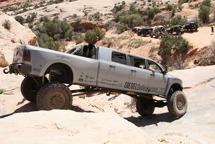 Easter Jeep Safari week in Moab, Utah is somewhat of the “mecca” for all things Jeep and buggie. Each year the Red Rock 4-Wheelers Club welcome more than 25,000 people converge on the city of Moab to hit the trails, see the sites and attend the tradeshow attached to this event. What you don’t see very often is a Mega Cab six door hitting the trails out with the Jeeps and buggies. Well, no more can you say that thanks to Skyjacker Suspensions and the guys at Diesel Sellerz.