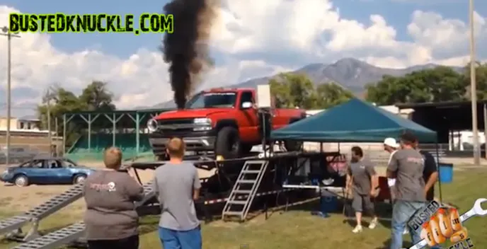 “We hold multiple records including setting the new single turbo record with that dyno pull at 1614. We were at Northern Utah Diesel Experts event in Richmond, Utah. I just made the event as they were getting ready to pack it up, we got the NOS wired at the last second on the dyno as they were strapping (it). Told everyone to stand back cause I was about to let it all hang out to beat the previous record that was 1451 and that’s exactly what happened. [It] came up on boost, was making about 1300hp before we ever hit the big stage of NOS with 2, 80 pills split. She came up hard and fast until World War 3 happened under the hood. Shrapnel was flying all over,” wrote BustedKnuckleVideo.