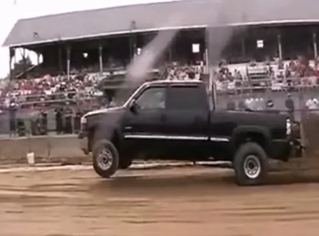 The video starts off by showing the Duramax preparing to pull and beginning his run and then it happens. The front two wheels come off the ground and the wheelie begins. Then the rest of the video I found myself chanting, “bounce baby, bounce baby, bounce”. The best part is even with all the popping and the bouncing, the driver keeps it running straight and continues to pull the sled toward the full pull line. The crowd is going wild. Every time those wheels rise off the ground, the crowd begins to cheer. I just kept waiting for the drive to send an arm out the drivers window in support and acknowledging his “badassness”.