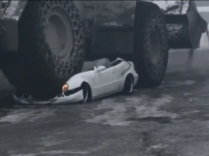 So if it’s real, it was a gutted junker on the way to the scrapheap and someone wanted to add a “viral” video to their resume.The logistics are admirable because it’s not every day you have access to a gigantic rig and an a expendable luxury car, so at the very least, kudos for that.
