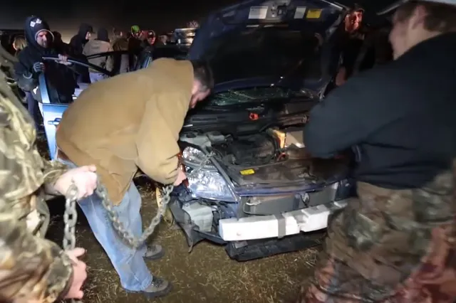 Then comes the closing act: chains are wrapped around and through the unibody frame and hitched to the rears of several trucks, in a classic dismemberment setup. It’s a real moment of release, in more ways than one, as the Prius is ripped and crushed to pieces.