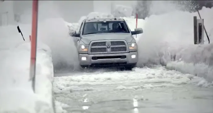 The first test Ram performs in the video is a slush test. This is where they are driving through a mixture of water and ice to soak the undercarriage of the trucks. As soon as they drive through the bath, they pull the trucks into a freezer and let the water ice up.
