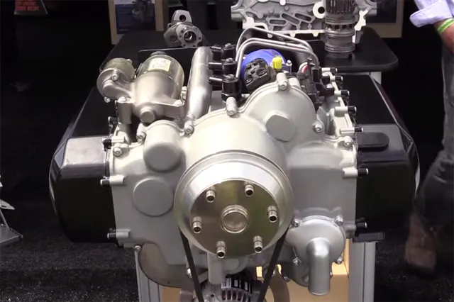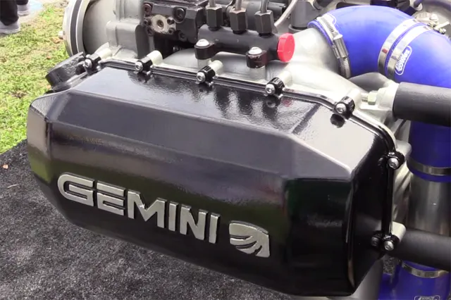 With its three-cylinder, six-piston, two-stroke design the Gemini Diesel takes technology from the German Junkers Jumo engines from the 1930s. The Junkers engines differ in that they applied their opposed piston design in a vertical plane, and produced far more power due to their massive displacement (nearly 17-liters).
