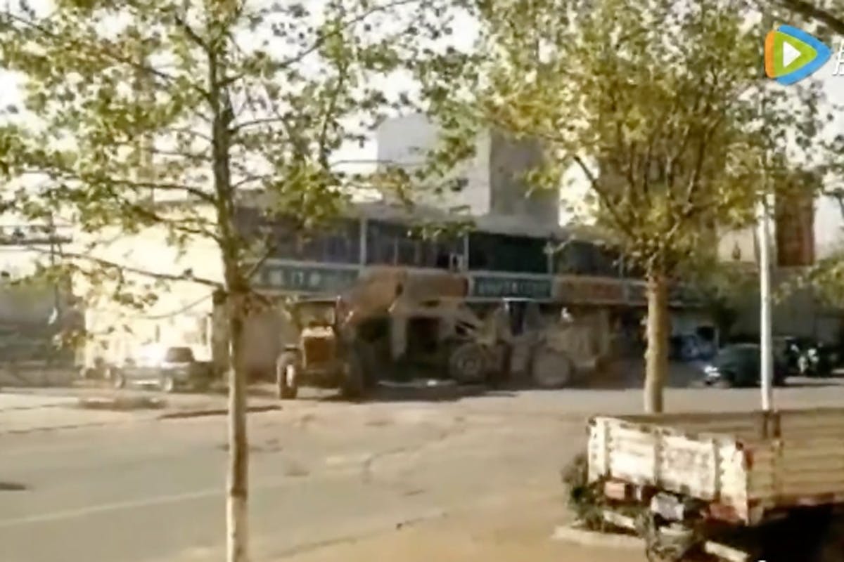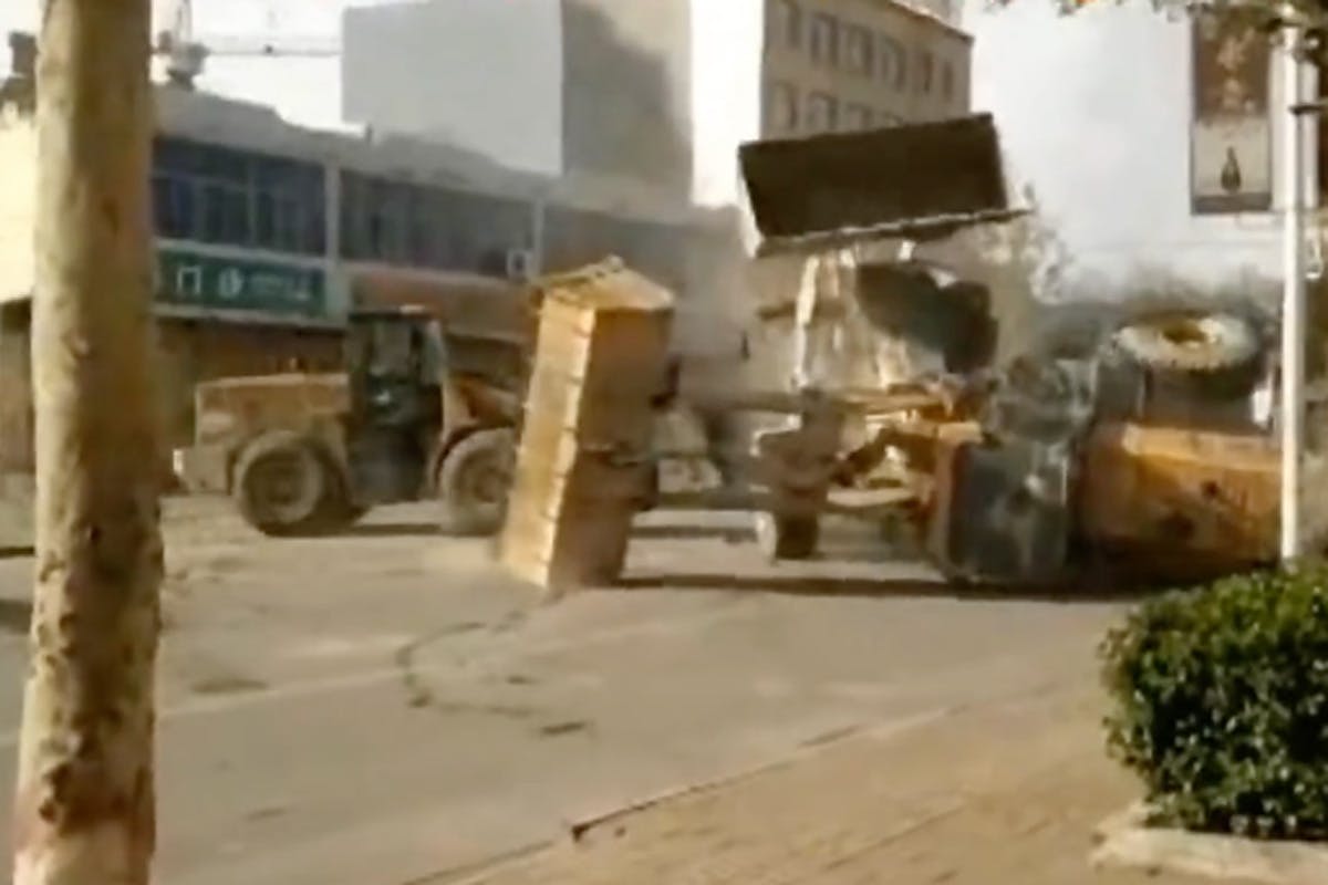 The video shows multiple bulldozers having a high noon show down. They are shown using the bucket on the front to fight one another. No movie film crew, or some new sensation on YouTube, but a full on battle.