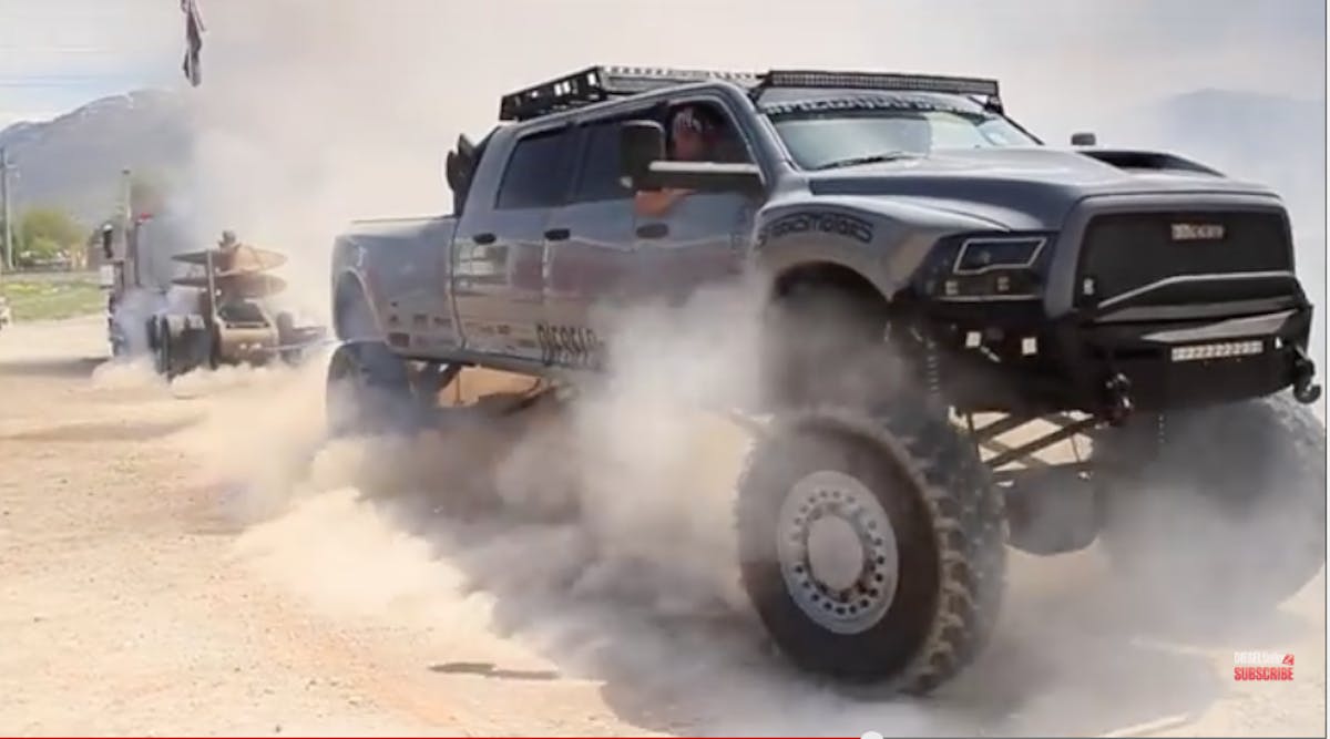 While filling up the MegaRamRunner at a local gas station, their hard working neighbors, the Most Wanted Drilling Crew, decided to challenge them to show them what it was like to face a truck with an equal amount of power that tows incredibly heavy loads for a living. And thus a challenge was born. Both sides assembled in the dirt at Diesel Sellerz and decided to hook up to have a good old fashioned tug-a-war fight. The competitors? The MegaRamRunner 600HP Cummins and 4 gears that has towed a max of 40,000 lbs with vs. a 1992 Marmon semi truck with 500 HP CAT engine and 18 gears that regularly tows 150,000 lbs.