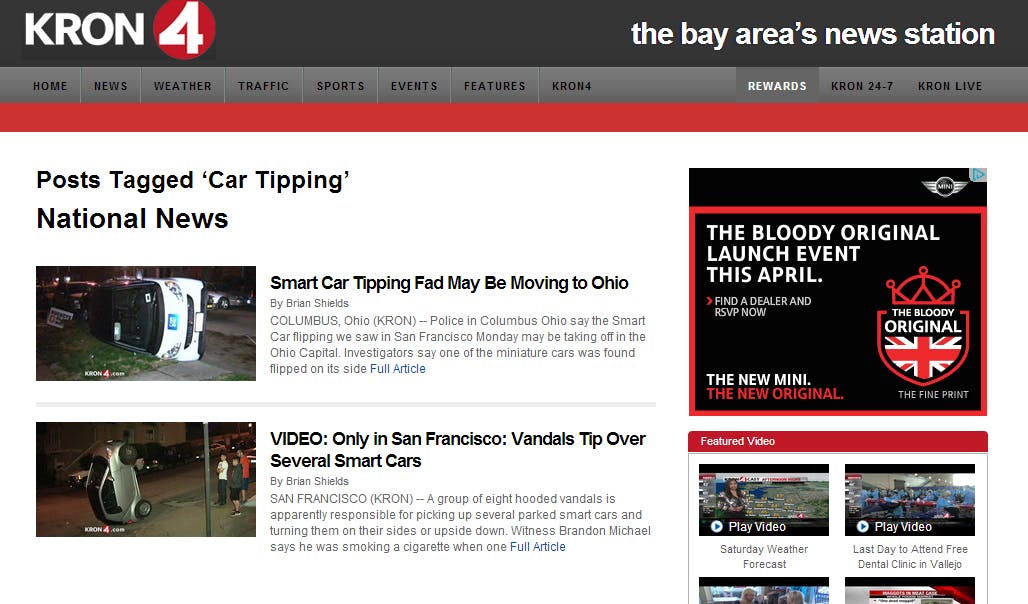 This has pretty much been a country thing until recently. There seems to be a group of urban cowboys in San Francisco missing the past time. So, these urban cowboys have found the next best thing, Smart Car tipping.