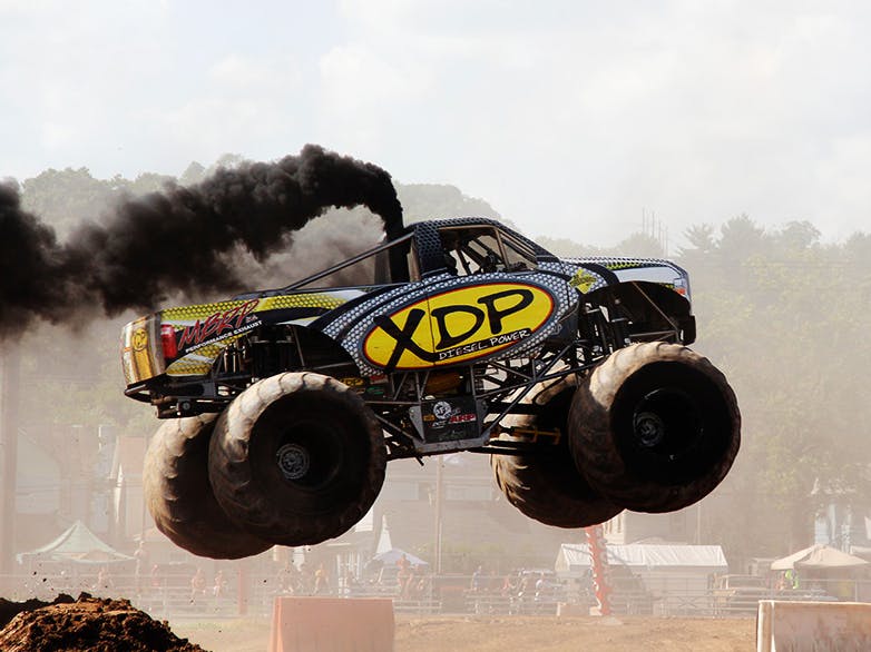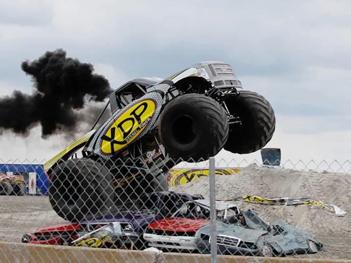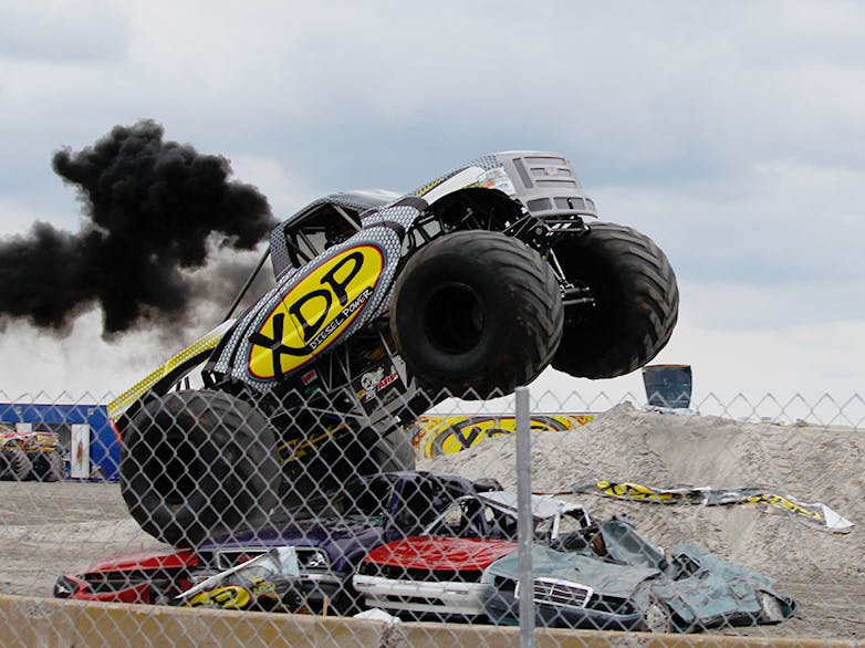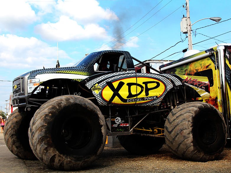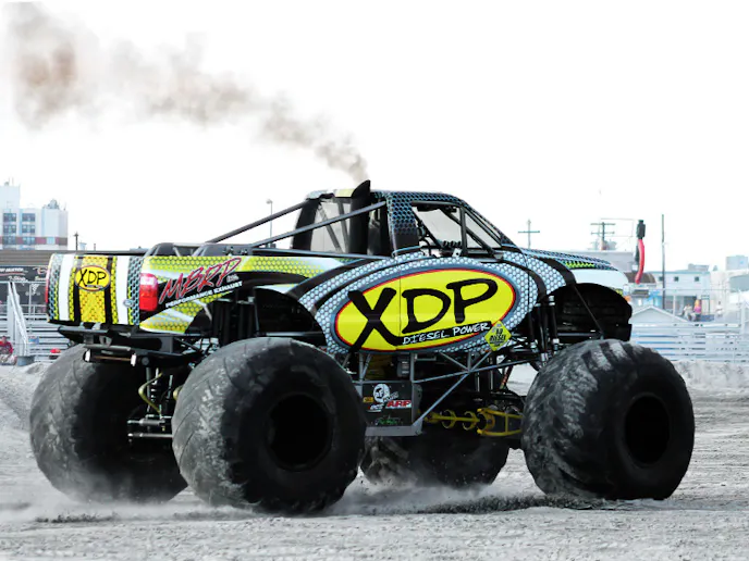 The XDP Monster Truck is built off of a Patrick Enterprises, Inc (PEI) monster truck chassis. From there, a 1,400 horsepower 5.9L Cummins (fully built with a billet cam, 14mm injection pump, nitrous injection, etc.) is mounted and connected to a Profab Machine transmission. The power is then sent out to the Clark planetary axles and to the ground.
