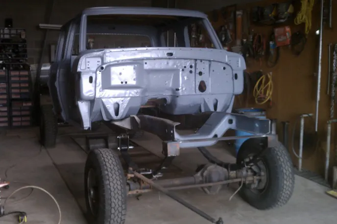 Zack brought the truck home and almost completely stripped it in a weekend. The frame was blasted to clean it up and make it easier to work on. The frame was in good shape, but he was worried it might not work for the Cummins power planned for it. So it was boxed from end to end using 1/4-inch steel plate.