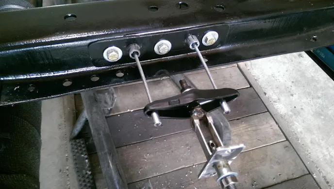 The truck came with a Dana 70 rear axle, and at first Zack was going to use it, but a friend of had a disc brake set up for a 14-bolt axle. Zack also had a 14-bolt with gears that matched the Dana 60 already installed in the front. A quick trade of the 390 V8 that came out of the truck for the disc conversion, and Zack was installing the 14-bolt rear end. At that point Zack began looking into the parking brake.
