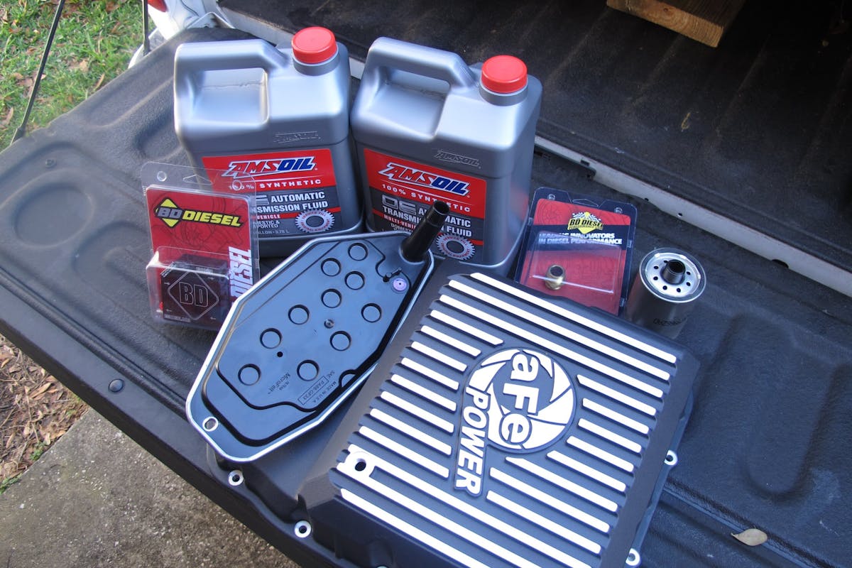 To accomplish this, I decided to add an aFe POWER deep transmission pan (P/N: 46-71160B), a larger-capacity rear differential cover (P/N: 46-71150B), and BD Diesel Performance‘s Cooler Bypass Delete (P/N: 1061527). While I was at it, I saw no reason to reuse the seasoned fluids, so I placed an order with AMSOIL for a few gallons of automatic transmission fluid for the transmission and transfer case, and a few jugs of 75W-90 gear lube for the differentials. Although this article is showing a Ram getting worked on, the maintenance intervals for the fluids are fairly common for you Ford and Chevy owners as well.