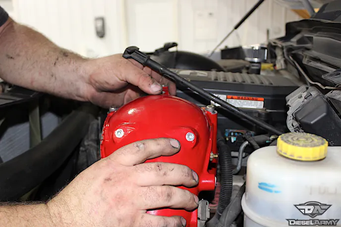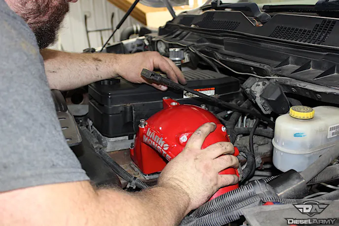 We took the truck over to our friends at C&B Diesel in Jackson, Missouri. There, we removed the old intake elbow to replace it with the upgraded Banks model. As you can see, with the new design, the elbow may encounter some clearance issues.