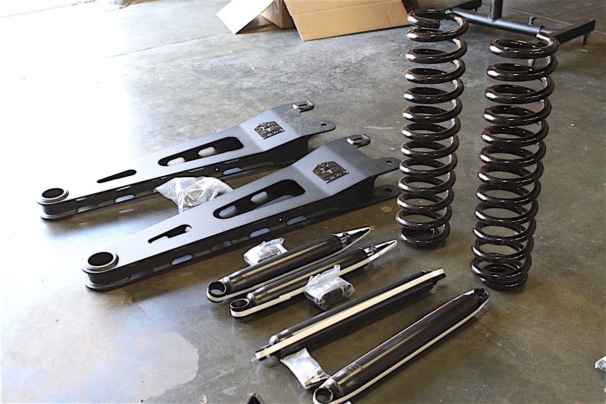 Once we had the parts in hand, we couldn’t help but admire the craftsmanship on them. Ash commented on this, saying, “Our radius arms are fully certified, U.S.-milled steel. We wanted them to be able to withstand anything without buckling. The coil springs, meanwhile, are full-length, and that adds to the ride quality. The lift blocks out back have an integrated bump stop wing, eliminating the need to stack blocks.”