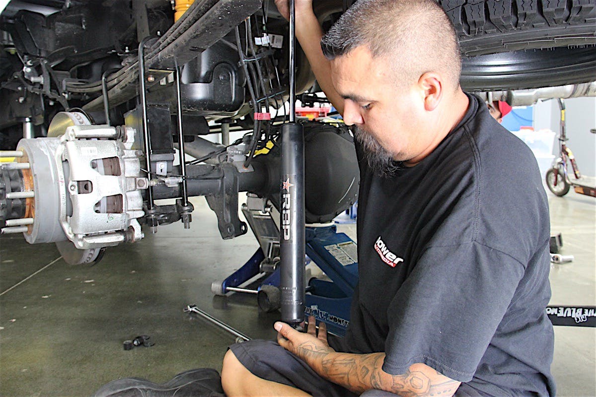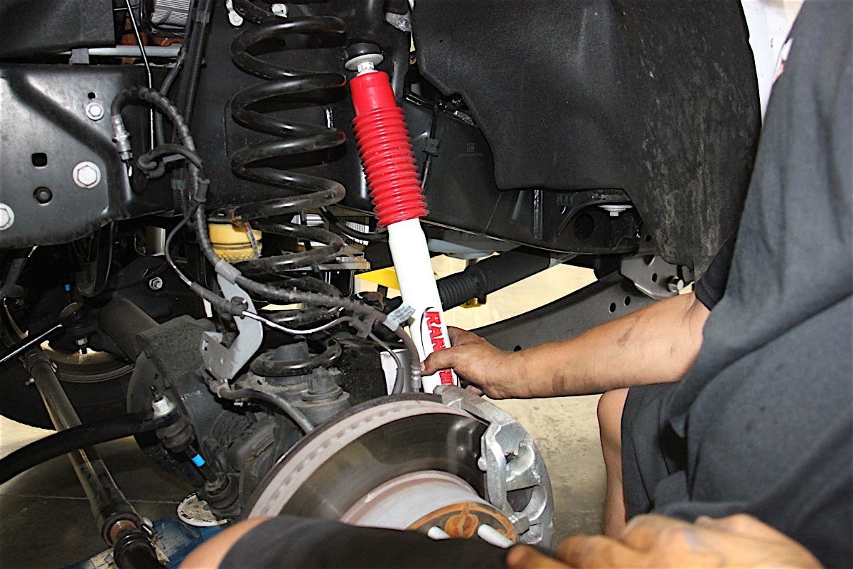 We then undid the top bolt on the shocks and swapped them for the new RBP shocks. Since they had a gas charge, we had to compress them, place them in the truck, and then let them extend until they lined up with the lower mount. The top bolt was inserted shortly after.