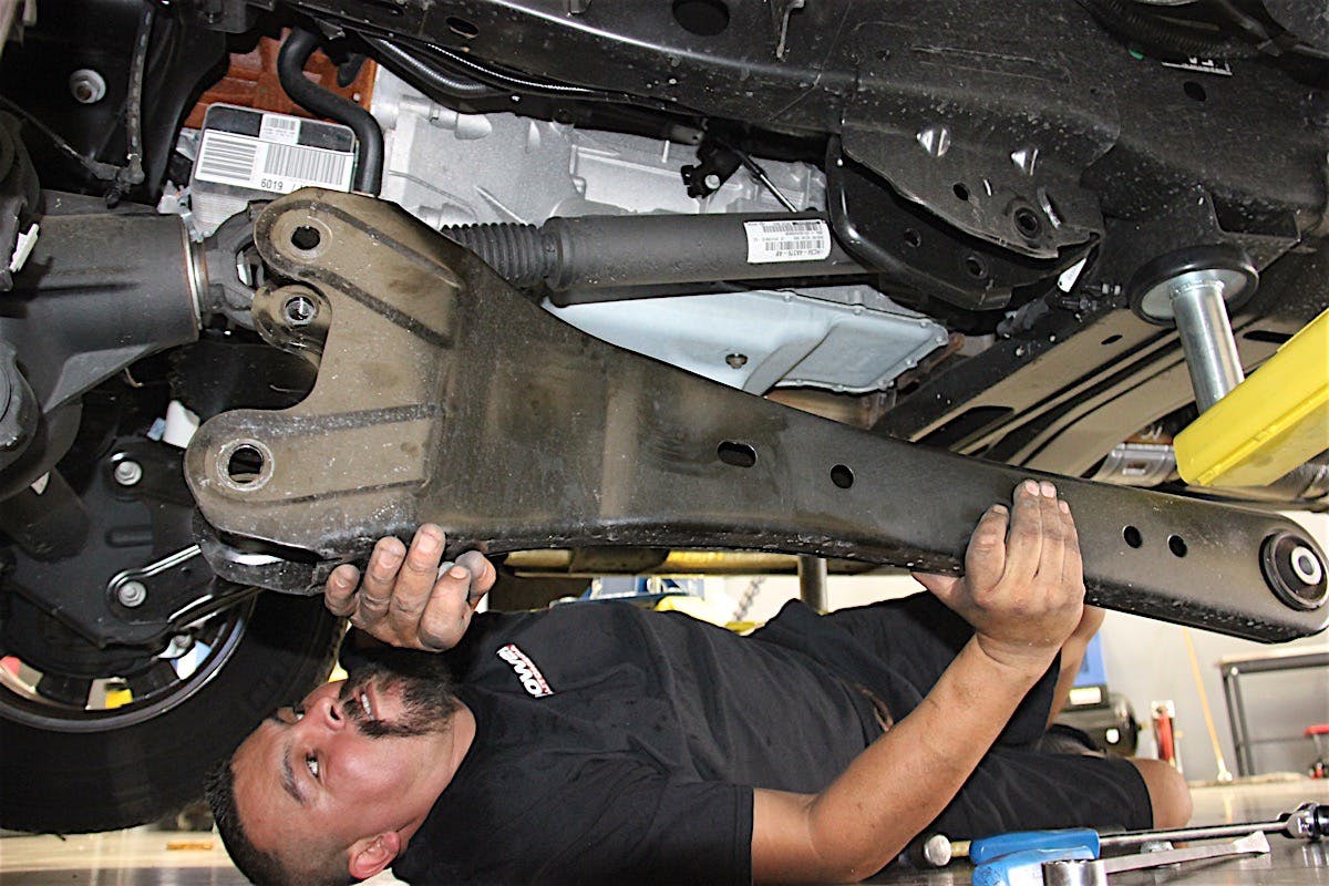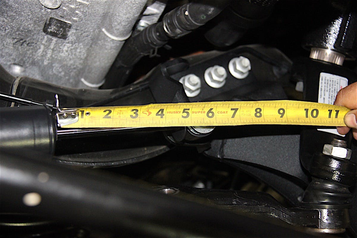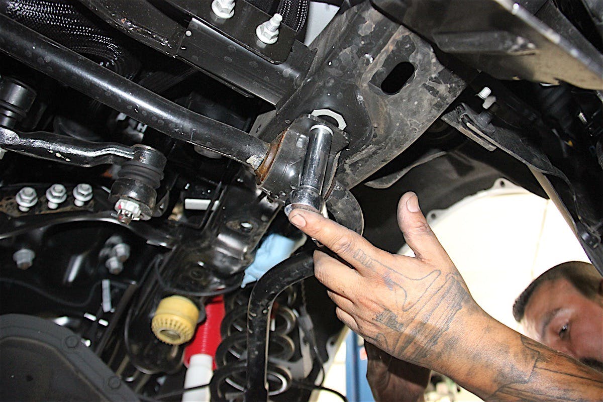Up front, things were substantially harder in terms of complexity, but we knew we could do it. We started by moving the brake line hold-down bracket to allow for vertical travel. Next, we unbolted the Panhard bar on the left side.