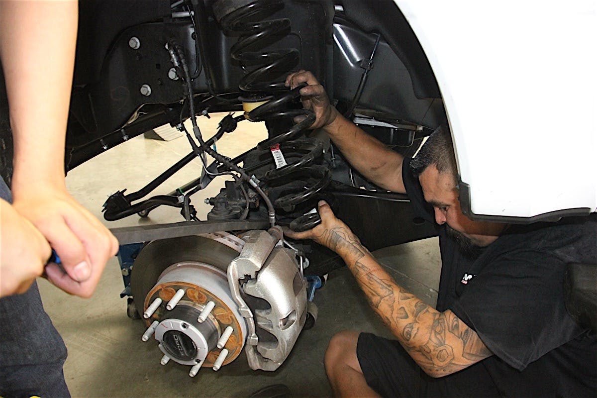 Installing the kit was an involved process, but it went much faster thanks to our Bendpak lift. We loosened the rear lugnuts and got the truck off of the ground, and then we removed the wheels. We placed jacks under the axle and rear driveshaft, which would allow us to move the axle up and down. This helped us move things around as needed as we went along.