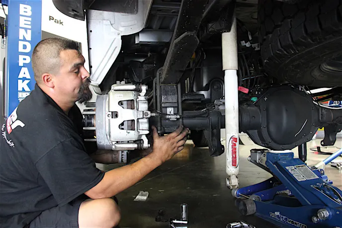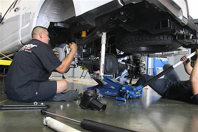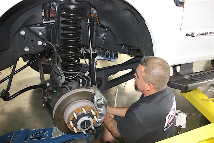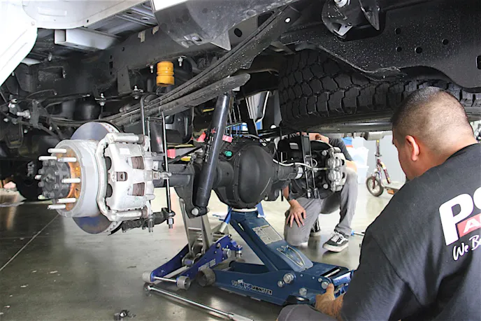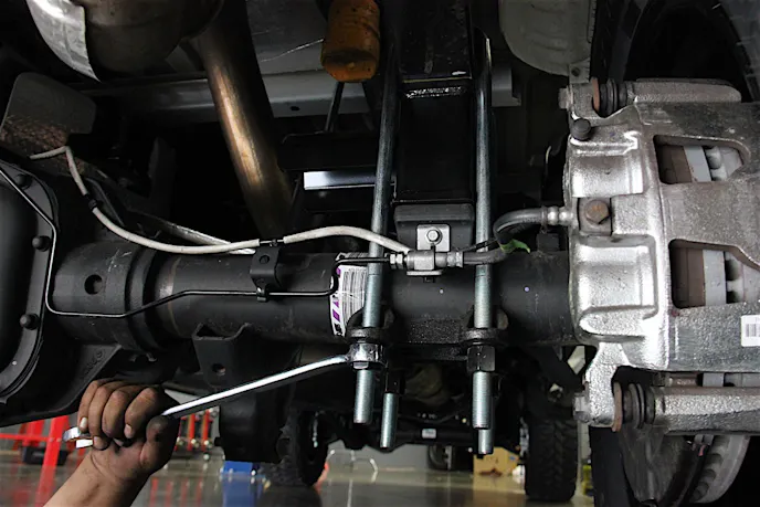 Installing the kit was an involved process, but it went much faster thanks to our Bendpak lift. We loosened the rear lugnuts and got the truck off of the ground, and then we removed the wheels. We placed jacks under the axle and rear driveshaft, which would allow us to move the axle up and down. This helped us move things around as needed as we went along.