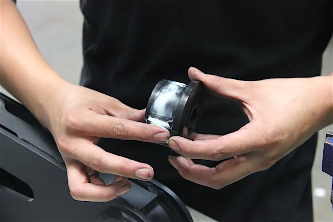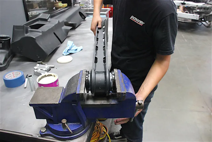 We took the new arm to a table and started applying white lithium grease to the bushing. This would prevent squeaking and chafing on the bushing. Using a vise, we pressed the bushings into the radius arms, and went back to install the arm.